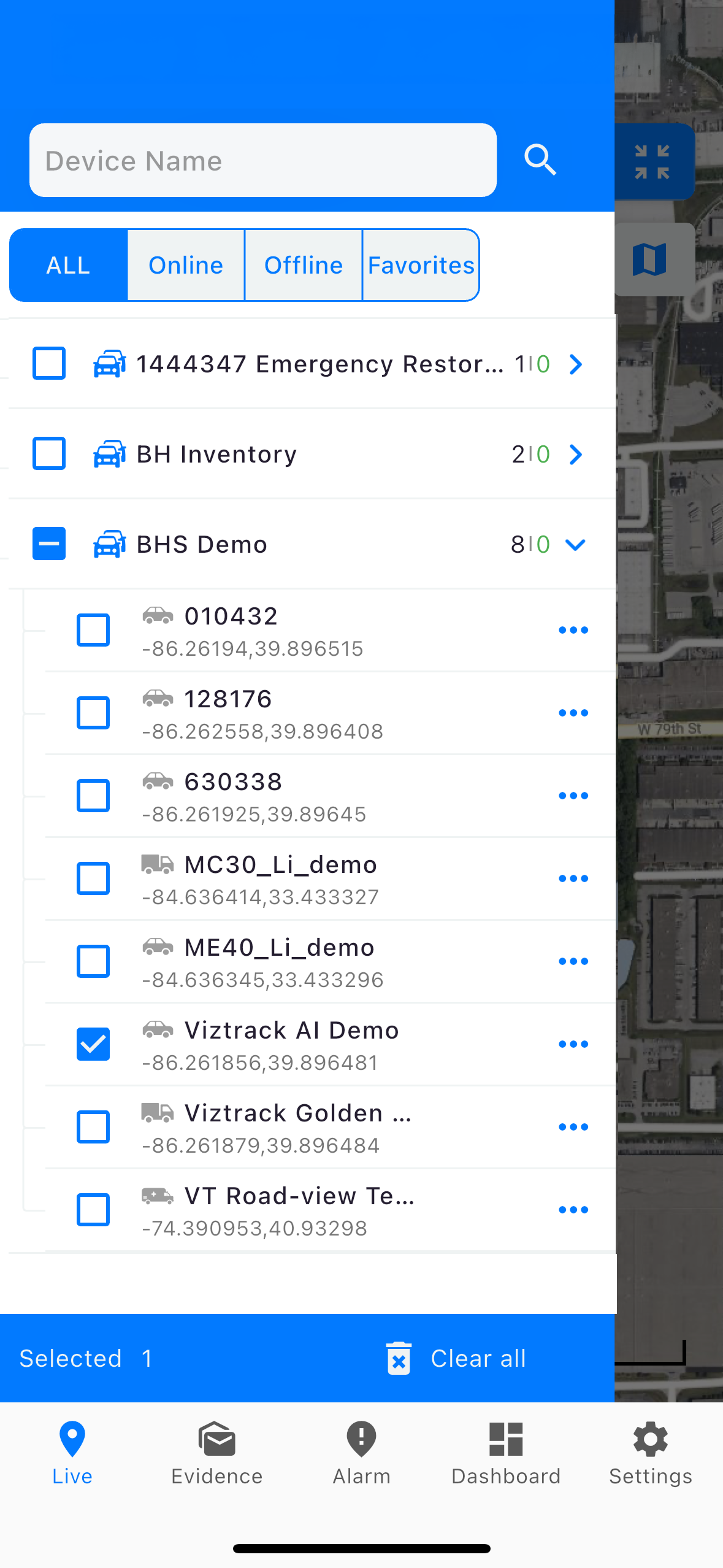 - From the Live tab, select the desired vehicle from the list and tap the arrow (▾) beside the Company name or ID.