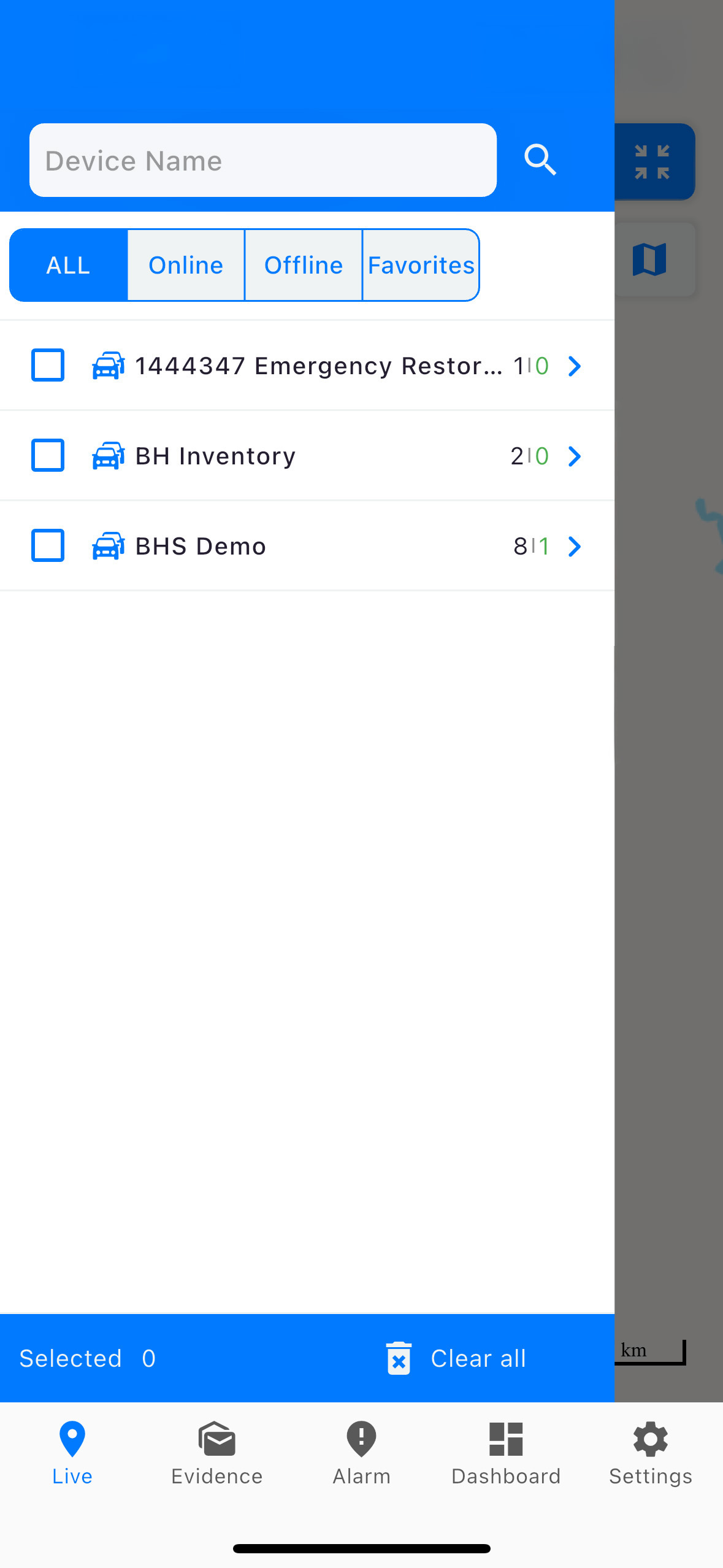 After logging in, the app automatically opens to the Live tab, where you can instantly view your active devices and see their real-time locations on the map.