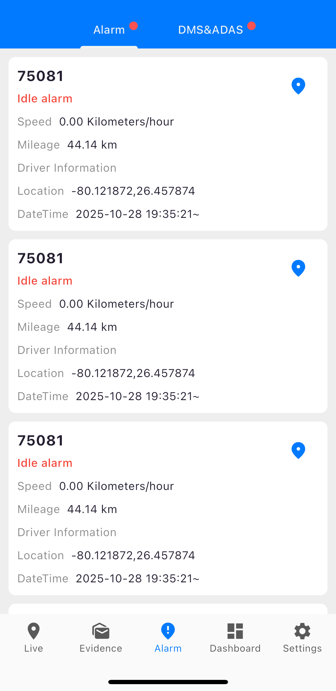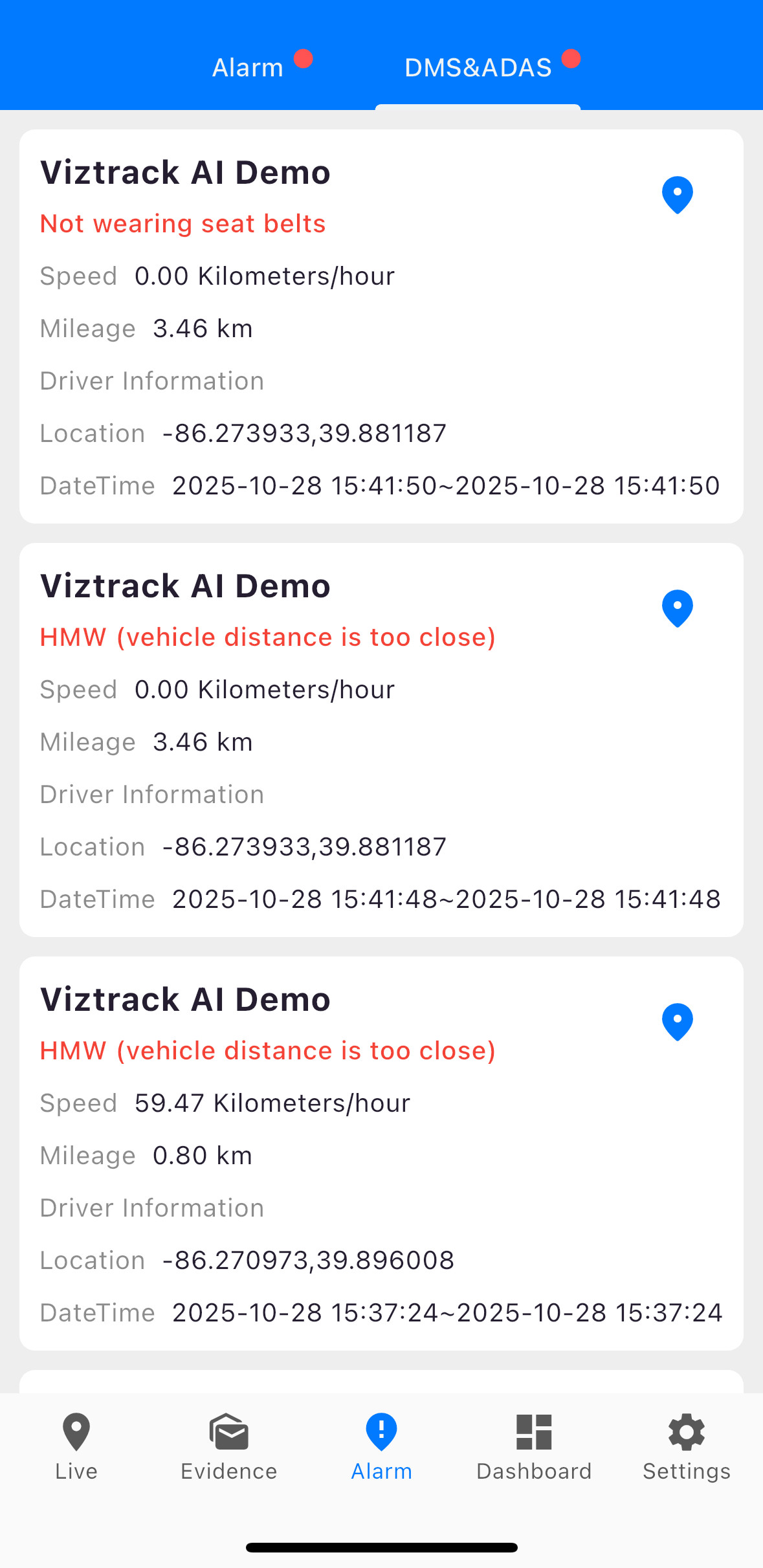You’ll see information such as alarm type, speed, mileage, driver, location, and time of the event.