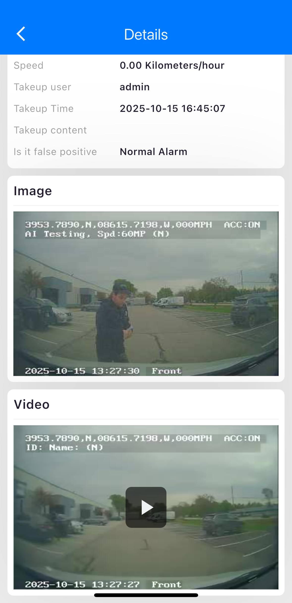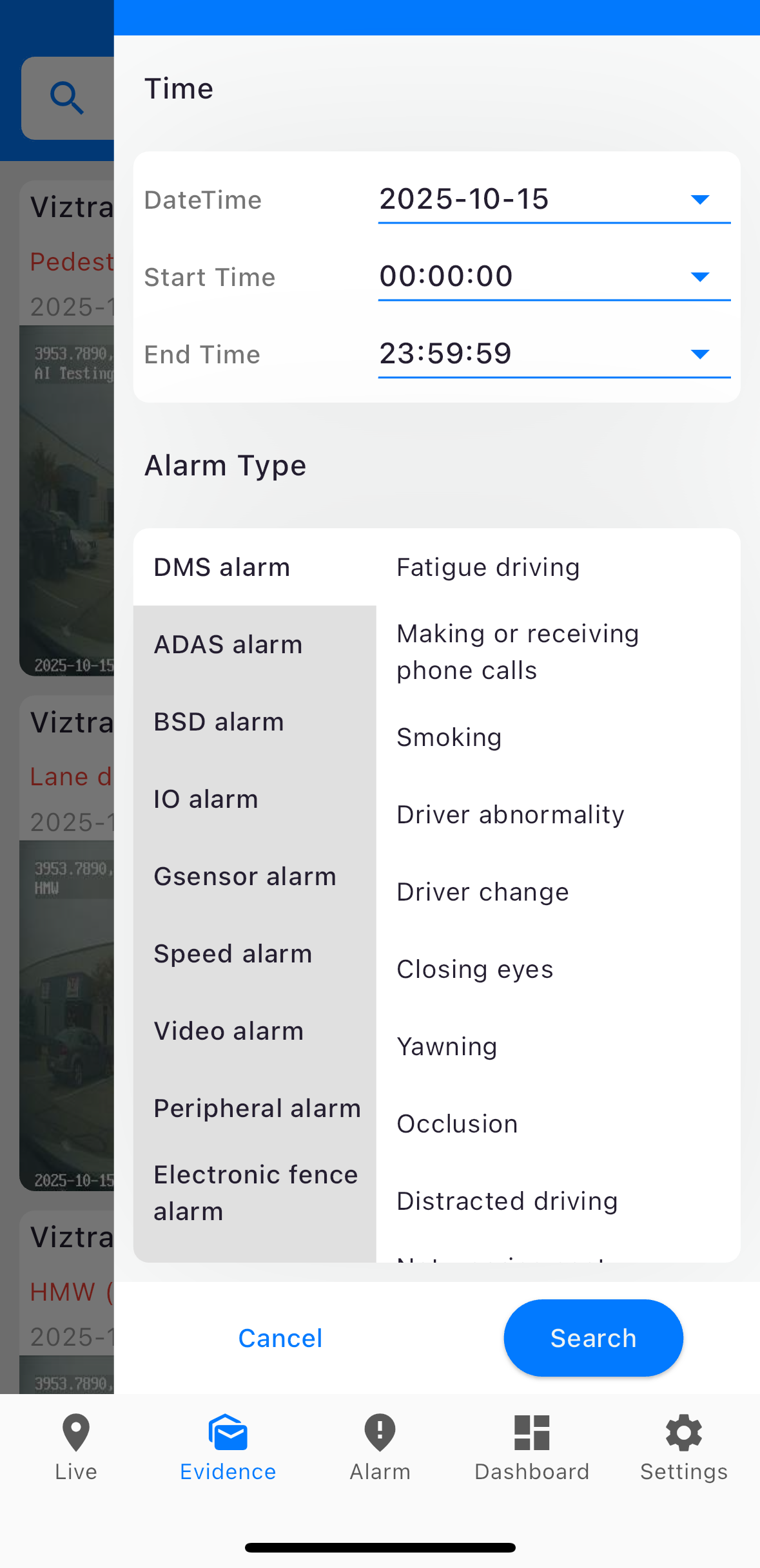 Tap any evidence item to view detailed information, including the event type, location, driver details, and other alarm information.