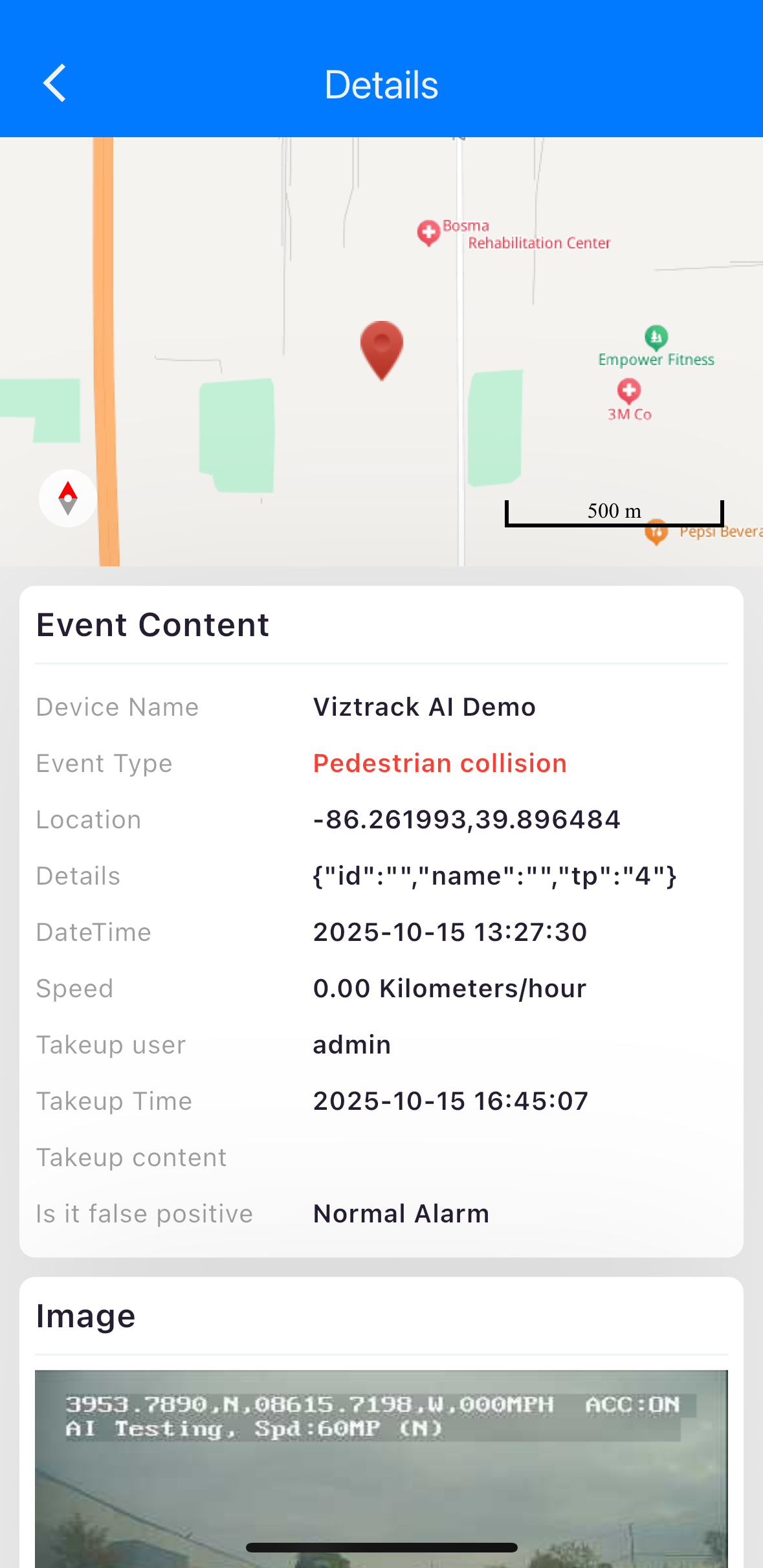 Tap the blue location pin to view the alarm’s exact position on the map, along with more details about the event.