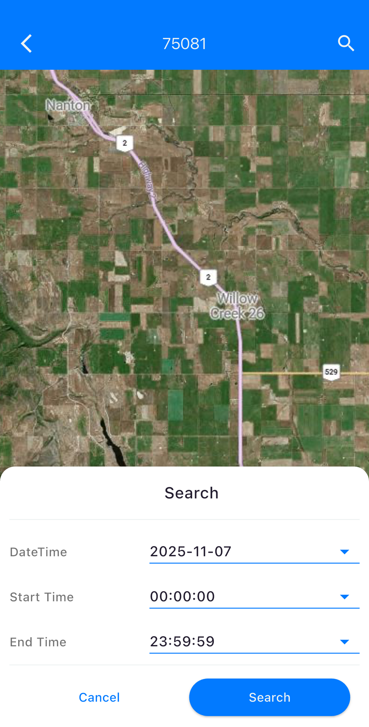 Set Start and End Times to Search for the Vehicle’s Historical Route: Users can specify a precise date, start time, and end time to narrow down the data and display the corresponding route taken by the vehicle on the map during that period (as shown in the search overlay).