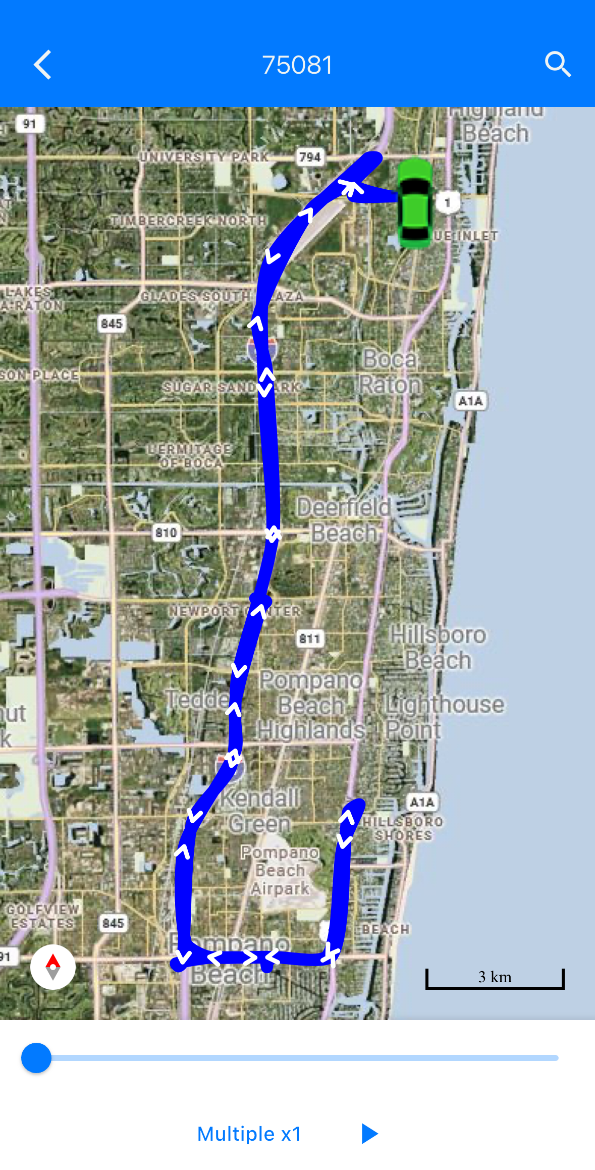 Playback Speed: The playback controls (visible with the "Multiple x1" indicator) allow the user to adjust the rate at which the vehicle icon moves along the displayed historical track.